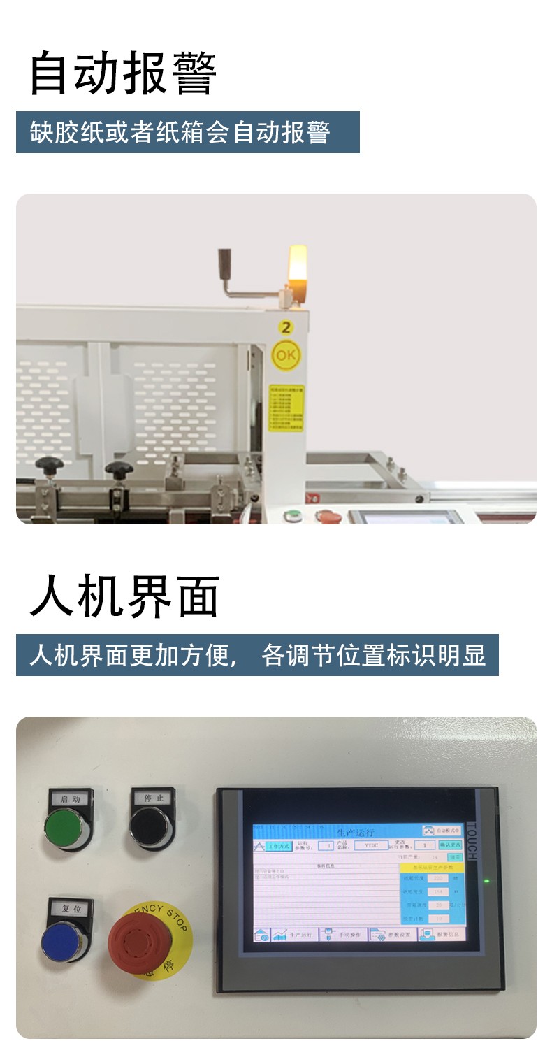 - 易上手:采用 “PLC + 觸摸顯示屏” 控制,操作人員無(wú)需專業(yè)技能,僅需通過(guò)界面設(shè)置紙箱規(guī)格(如長(zhǎng)度、寬度、高度),設(shè)備可自動(dòng)適配調(diào)整,切換規(guī)格僅需 1-3 分鐘(人工切換需重新熟悉箱型,耗時(shí)更長(zhǎng));