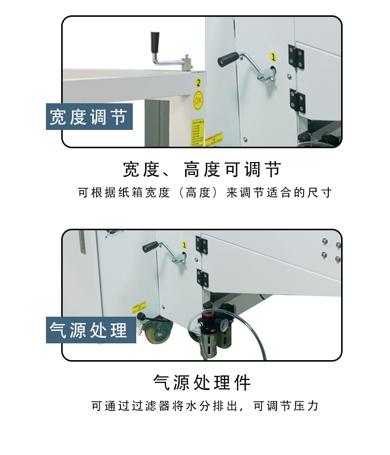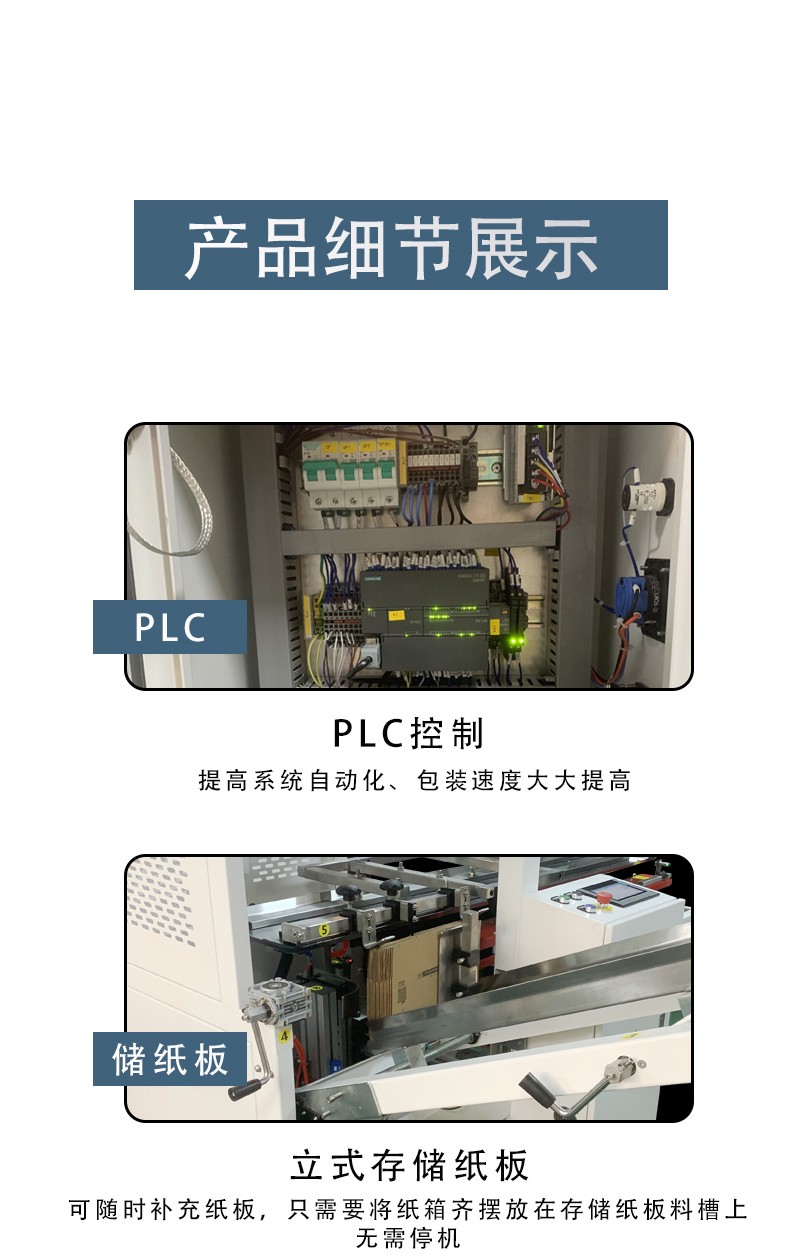 設(shè)備通過(guò) PLC 程序精準(zhǔn)控制每一步動(dòng)作(如吸箱力度、折邊角度、膠帶粘貼壓力),確保所有紙箱的