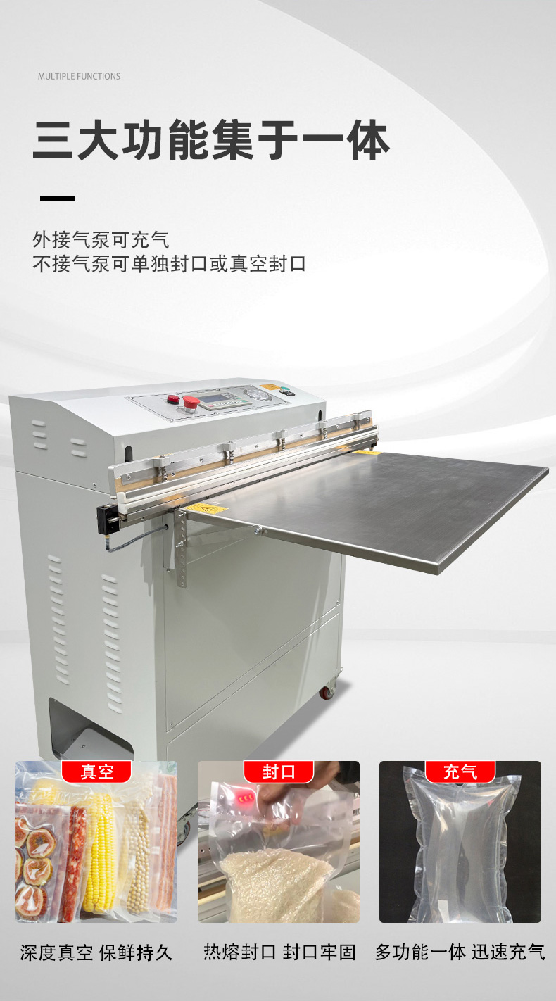 多功能一體的外抽真空包裝機,是在基礎外抽真空功能上,整合了充氣保鮮、封口、印字等多種功能的設備,能一站式滿足不同物品的包裝需求,核心優勢是功能集成度高、場景適配性強,無需額外購置多臺設備。