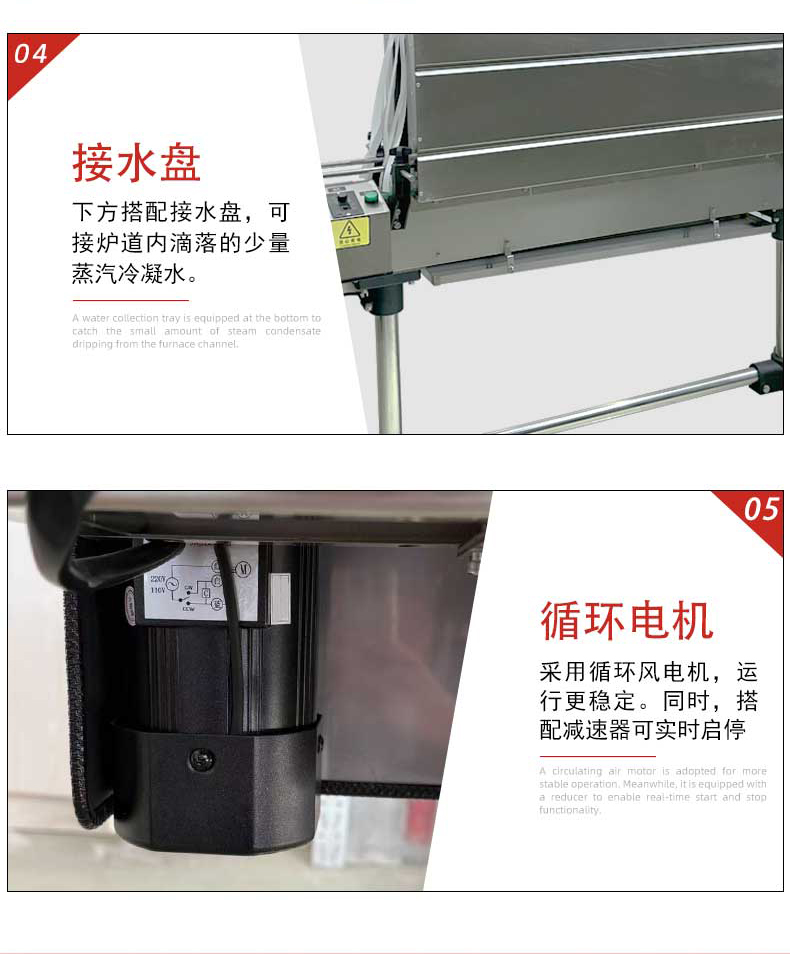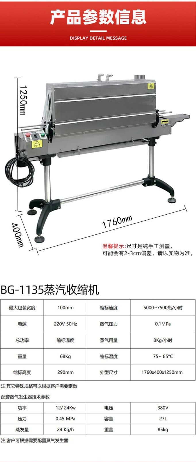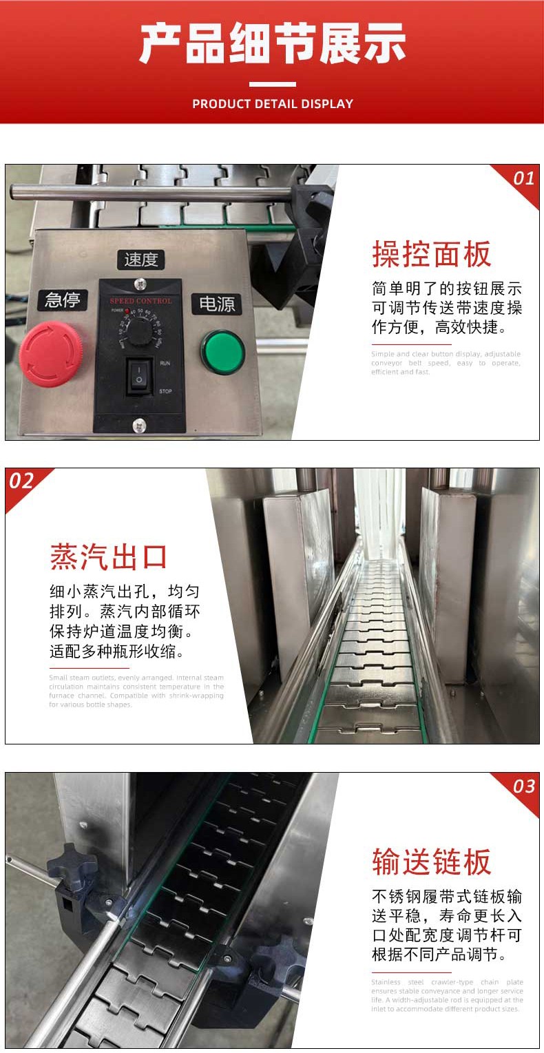 - 收縮通道:內部設有蒸汽噴射孔或噴嘴,通道長度與寬度根據產品尺寸可調,確保蒸汽均勻覆蓋。