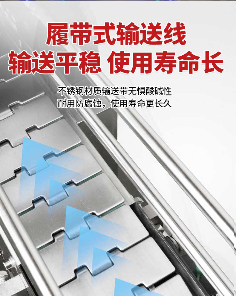 - 傳動系統(tǒng):采用網帶、鏈板或滾筒輸送產品,速度可變頻調節(jié),通常為 0.5-10m/min,以適應不同產能需求。